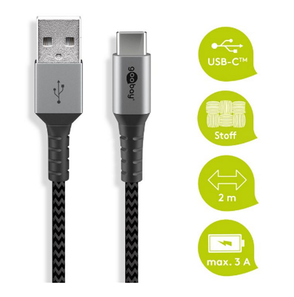 Goobay Daten- / Ladekabel USB-A auf USB-C , 2m, Textilummantelung, Black mit Metallsteckern, besonders robust! Stecker Typ A auf USB Typ C