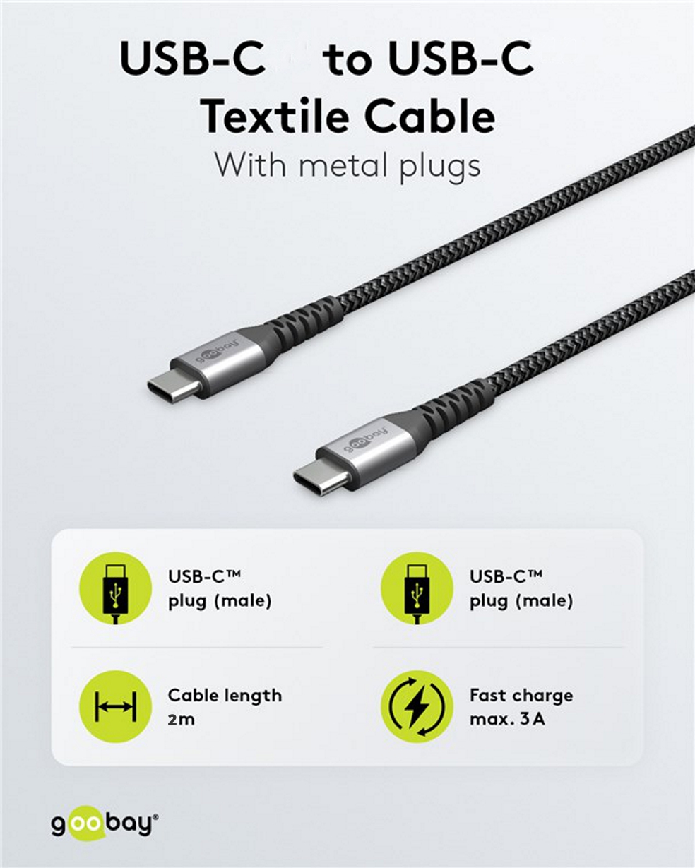 Goobay Daten- / Ladekabel USB-C auf USB-C für alle Geräte mit USB-C Anschluss , 2m, Textilummantelung mit Metallsteckern, besonders robust! Stecker TypC auf TypC!