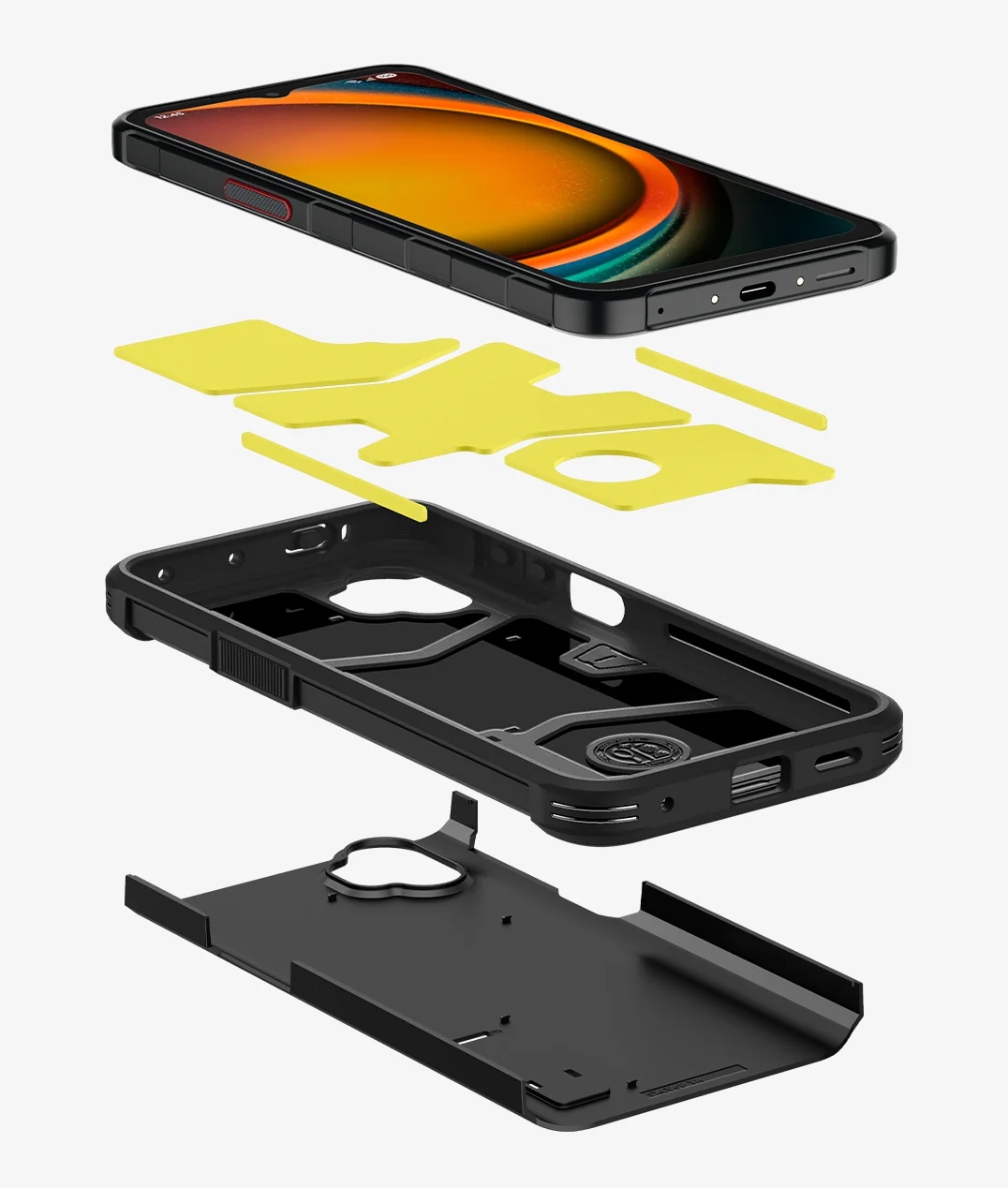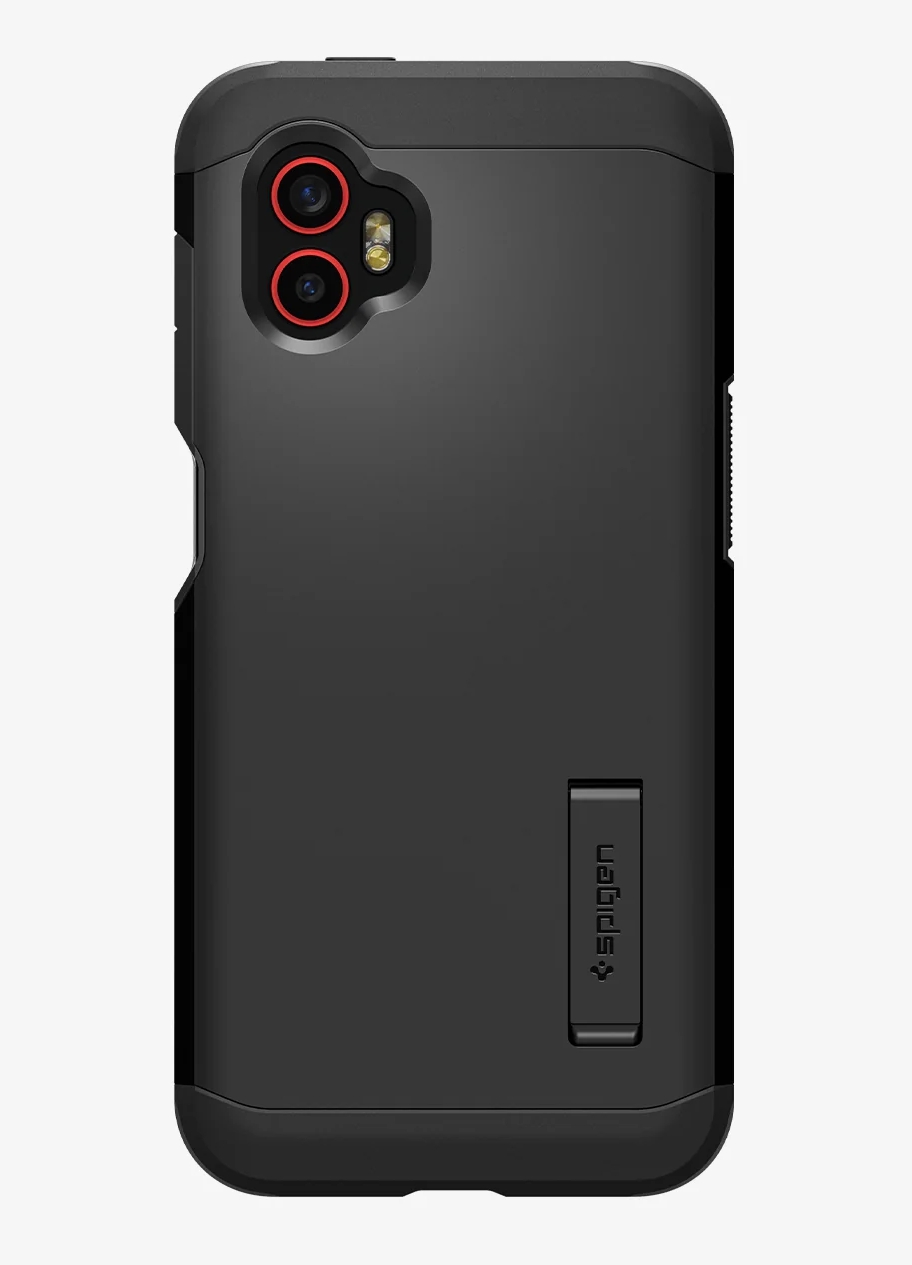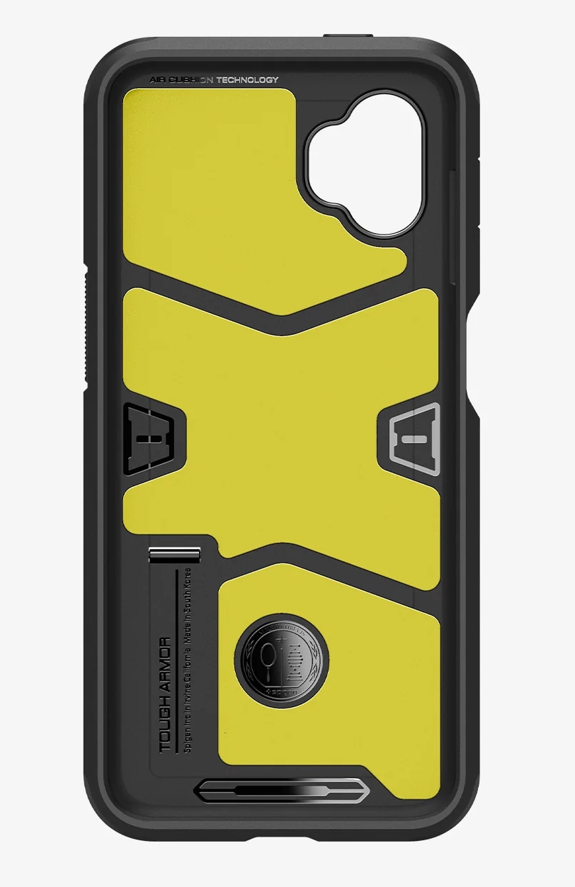Die Case Tough Armor- Serie von Spigen ist ein robustes und hochwertiges Cover für das SAMSUNG Galaxy XCover 7 Pro. Seine zweiteilige Konstruktion besteht aus abriebfestem Thermoplast und einem Verstärkungsrahmen aus Polycarbonat. Im Inneren der Hülle befindet sich eine Füllung in Form von festem "Schaum", die zusätzlichen Schutz gegen Stöße oder Herunterfallen des Geräts bietet. Die Hülle passt perfekt und schränkt die Möglichkeit des kabellosen Ladens nicht ein. Die leicht erhabene Form des Gehäuses um die Kamera und den Bildschirm schützt es vor Kratzern, indem das Telefon knapp über einer ebenen Fläche angehoben wird.